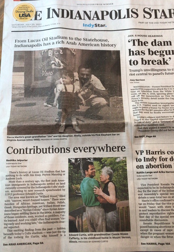 I was thrilled when Rashika Jaipuriar’s beautifully-written article on the Arab Indianapolis History Project, its origins, and its impact on IUPUI student Sierra Martin’s family made the front page of the Indianapolis Star on July 23, 2022.